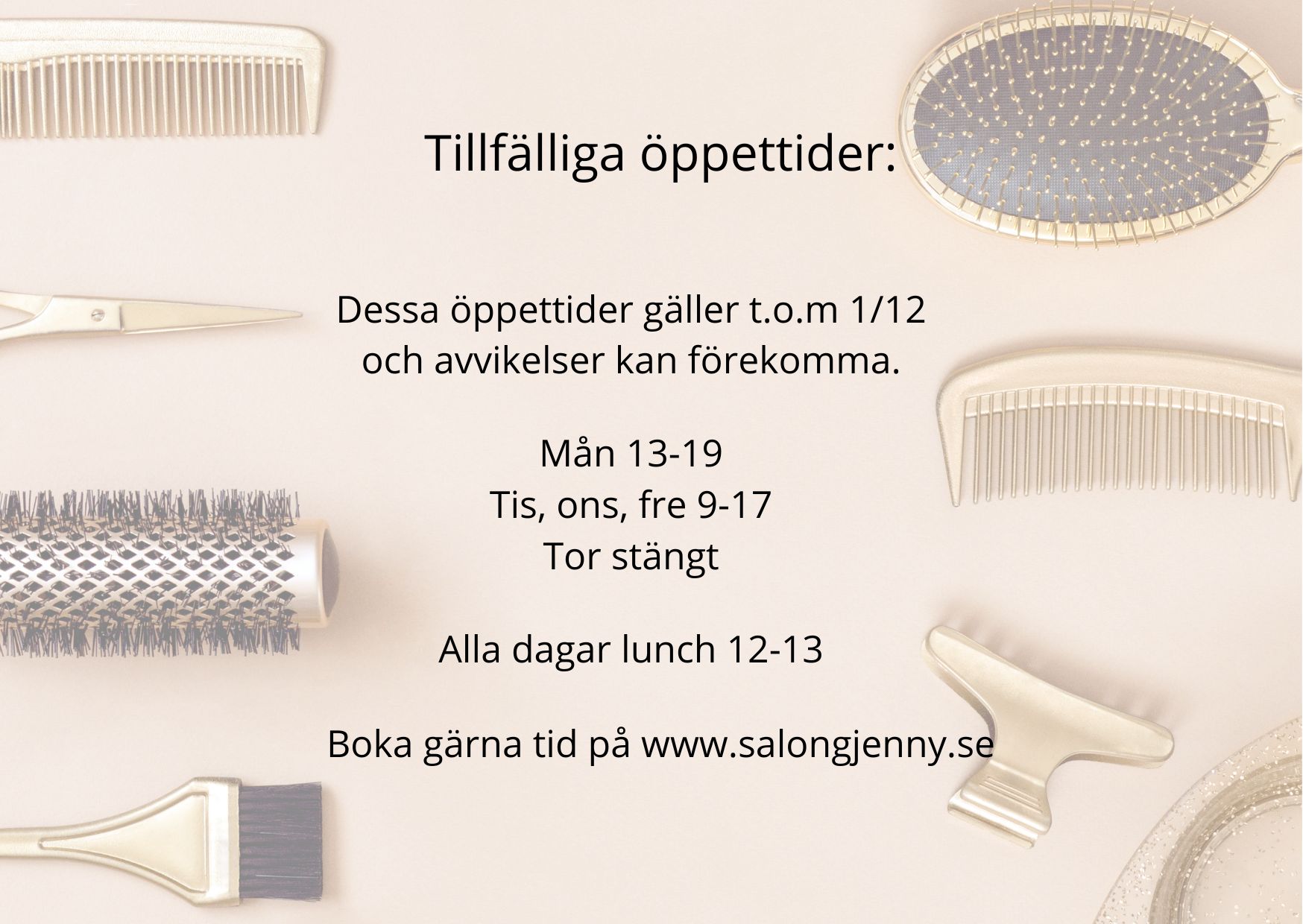 Välkommen till oss på Salong Jenny. Här kan du få allt från klippning, permanent, färgning, slingor och öronhåltagning.
